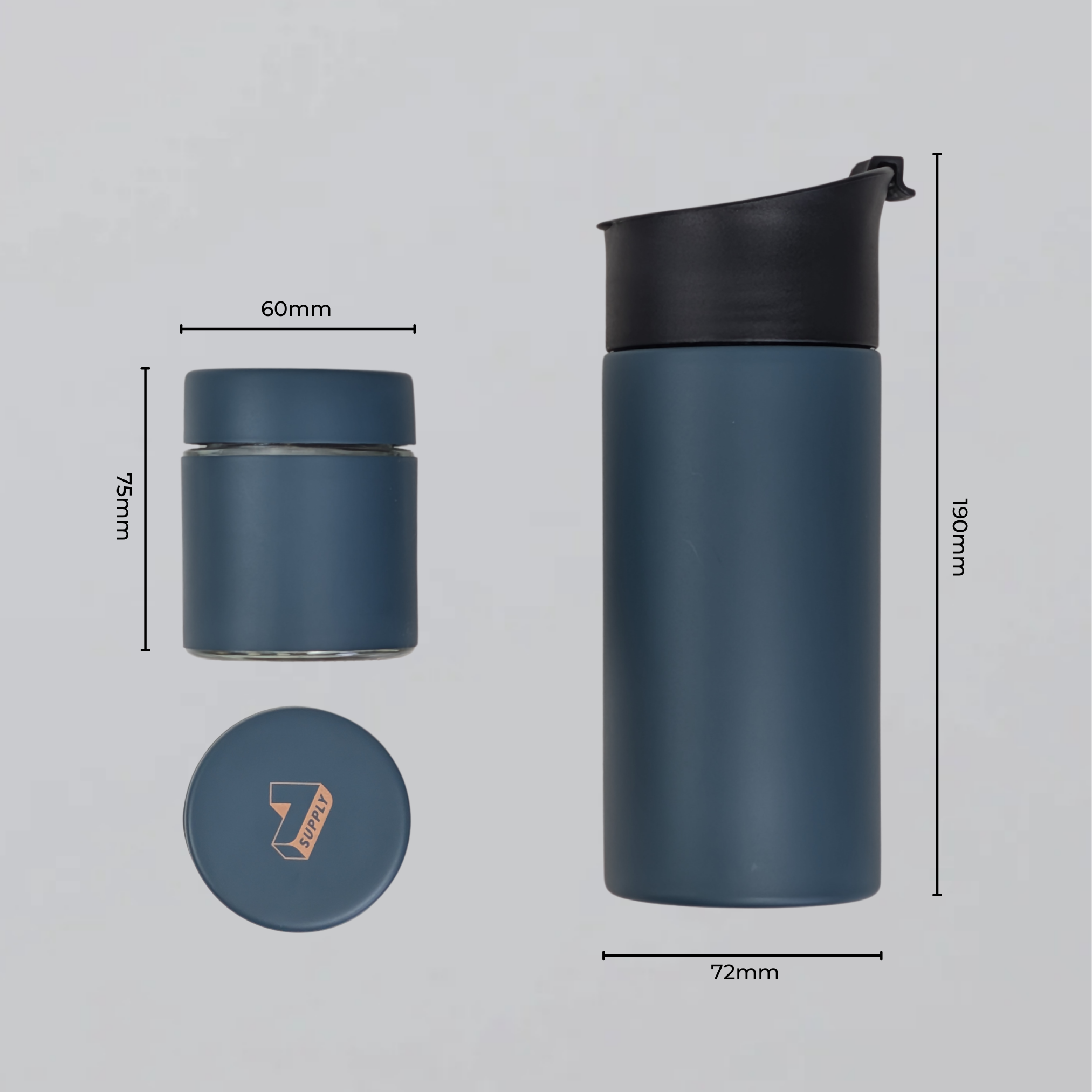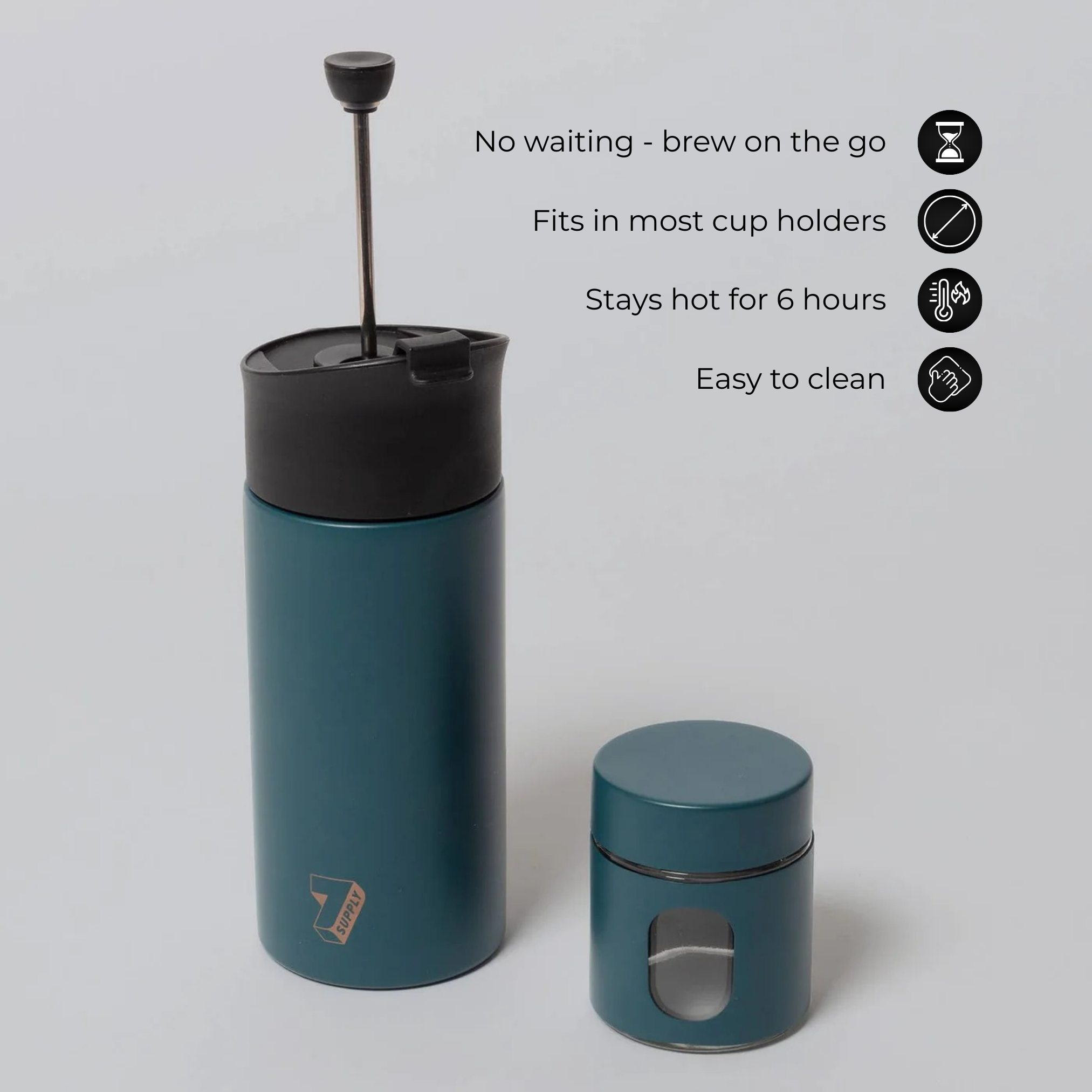 This set is made for people who genuinely care about their coffee. The metal flask doubles as a French press, so you can brew fresh coffee wherever you are — just add hot water, screw the top on and you're ready to go, let it brew for 3 minutes, and press down the plunger for great tasting coffee. The matching jar keeps your ground beans sealed and ready with a child proof styel lid so it wont open in your bag and everything packs neatly into a sturdy a very high quality travel case.